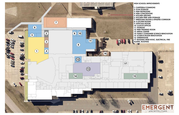 The existing wrestling room and boys locker room at the high school would convert to a space featuring four accessible locker rooms, two offices for coaches, a room for officials, and storage. A new wrestling room would be built, allowing the district to consolidate activities for its boys and girls wrestling programs in a central area.